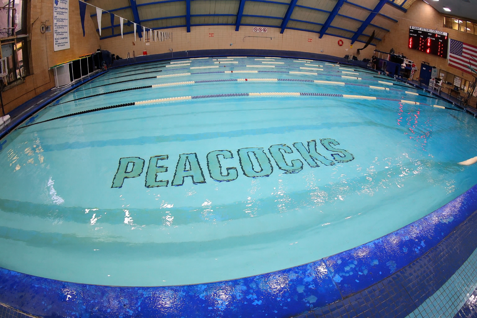 Indoor swimming pool with lanes for lap swimming, with the word 'PEACOCKS' written on the pool floor. The pool area includes a scoreboard, American flag, and seating area.